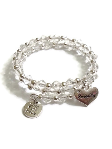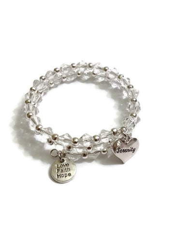 Login to view price.Rock your Recovery with this Wire Wrap Beaded Beauty. The pretty glass beads surround your wrist in sparkly Bling. A silver tone Serenity charm dangles from one end, and a Faith Love Hope charm on the other. The wrap design fits most wrists.